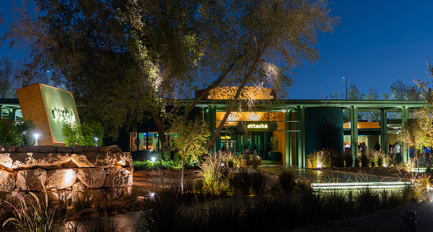 Situated in Riyadh’s Diplomatic Quarter (DQ), Attaché is a welcoming and beautifully designed community hub dedicated to all things food and beverage, leisure and music enjoyment. Launched in September 2024, it is the brainchild of MDLBeast, a Saudi based record label and creative platform for music, art and culture rooted in the Middle East and shared across the world. (For your information: MDLBeast puts on the yearly Sandstorm festival – the giant music event bringing big names such as Eminem, Thirty Second to Mars, Guns N’ Roses, Amr Diab and others to the Saudi capital).