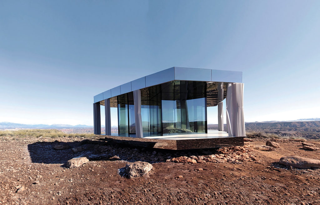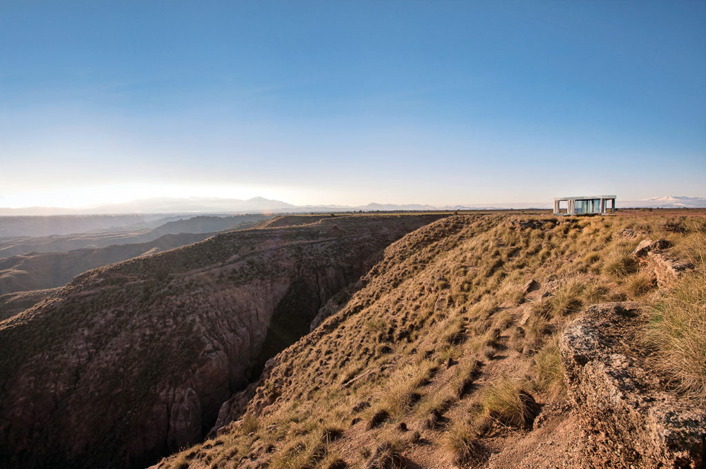 Conceivably, if the trogloditas had had access to today’s technology, their dwellings might have looked more like these. Indeed, the landscape begs for a transparent home like this, as the desert’s shrubby yellow grasses create a soothing texturescape all the way to the horizon, at which point the view is punctuated by low mauve mountains. Deep arroyos rend the rocky earth, revealing burnished pink and taupe soil in the steep, sandy canyonlets. The area is renowned among stargazers for its altitude and remoteness (and subsequent lack of ambient light). It’s a place where you want to be able to see to the horizon all the time.